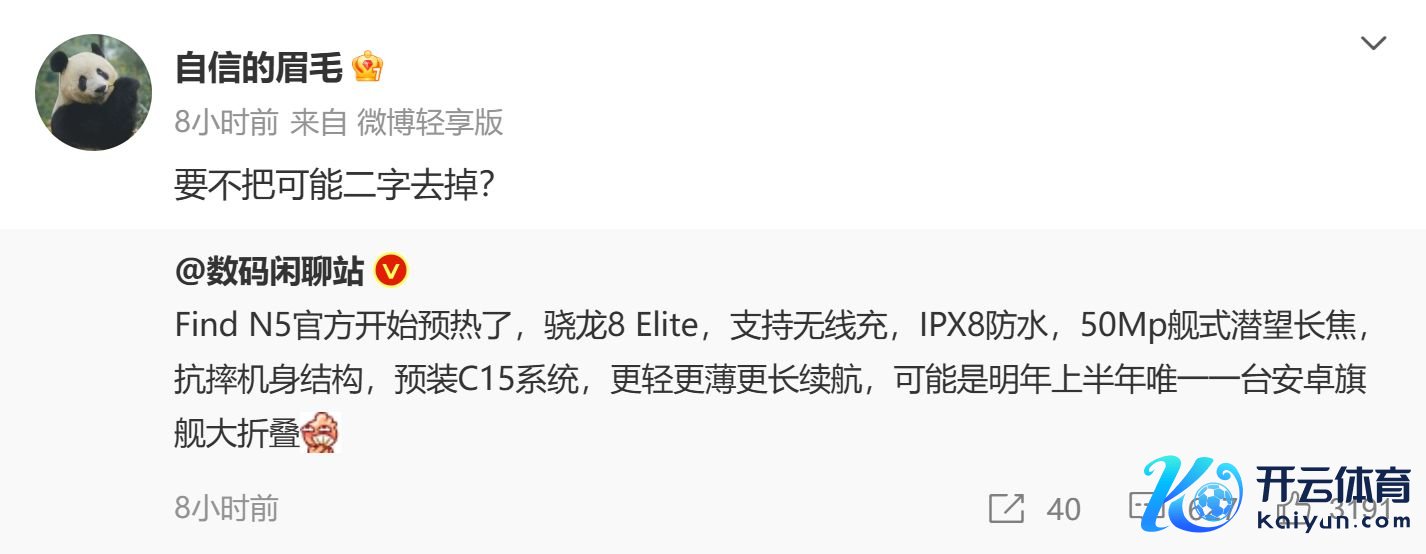 据着名数码博主数码座谈站爆料,OPPO最新的折叠屏旗舰手机OPPO Find N5依然开动预热。详细OPPO前副总裁沈义东说念主(即微博用户@自信的眉毛)和OPPO Find系列居品精采东说念主周意保的说法,OPPO Find N5有望在2025年春季发布,该机型或将成为来岁上半年唯独一台安卓大折叠屏旗舰手机。
